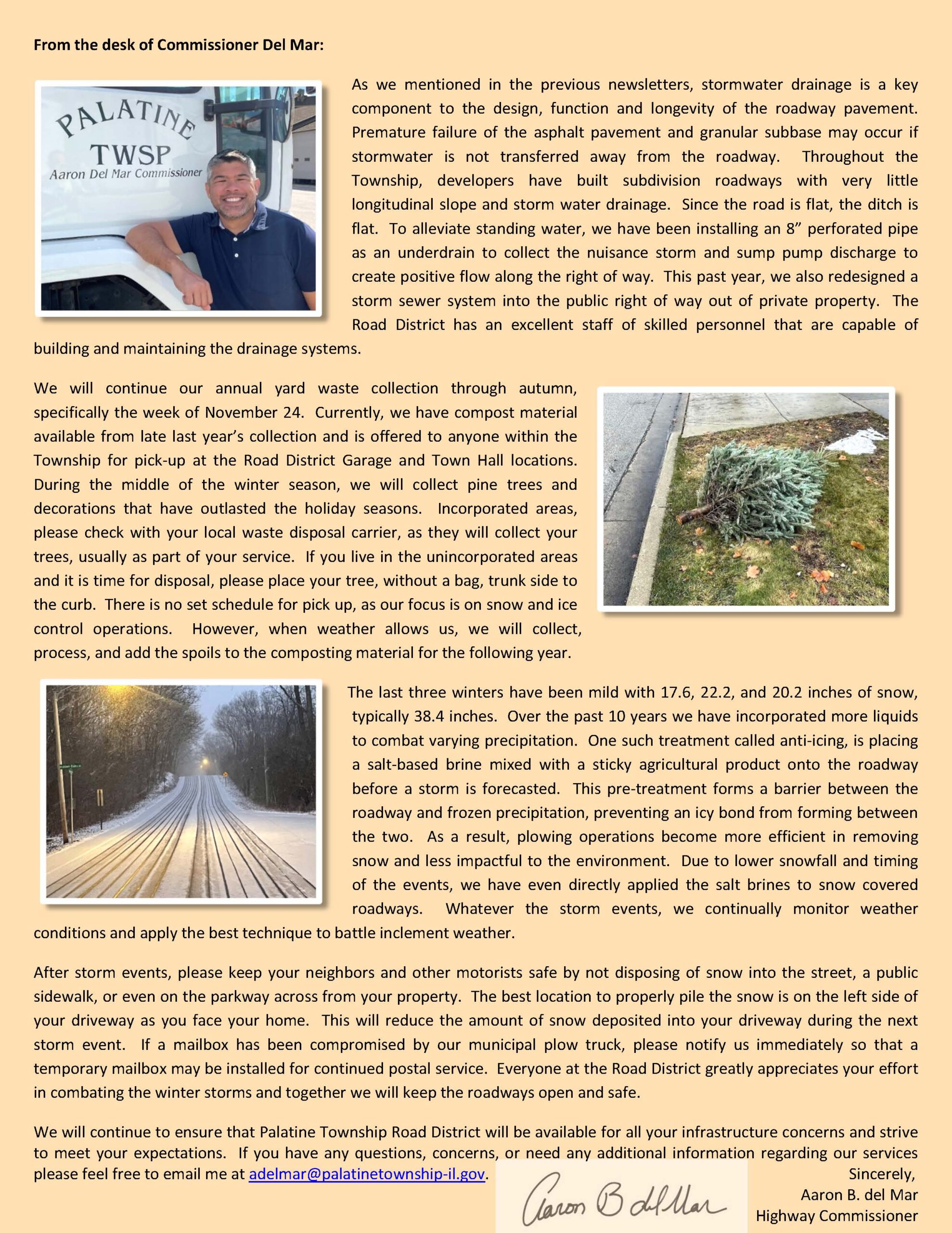 We will continue to ensure that Palatine Township Road District will be available for all your infrastructure concerns and strive to meet your expectations. If you have any questions, concerns, or need any additional information regarding our services please feel free to email me at adelmar@palatinetownship-il.gov.